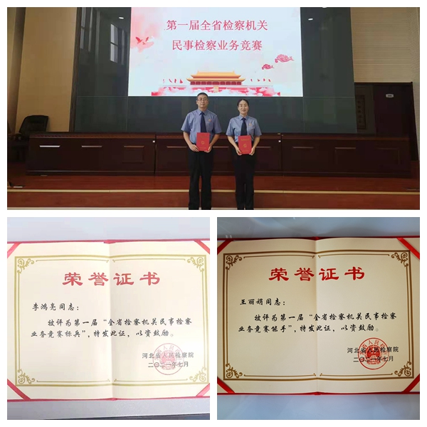近日,在全省第一届检察机关民事检察业务竞赛中,邯郸市检察院第六检察部干警李鸿亮荣获第一届“全省检察机关民事检察业务竞赛标兵”、峰峰矿区检察院干警王丽娟荣获第一届“全省检察机关民事检察业务竞赛能手”荣誉称号。