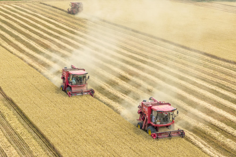2025年6月9日,河南省三门峡灵宝市西阎乡东古驿村村民在抢收小麦(无人机照片)。新华社发(杜杰 摄)